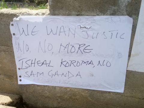 The aggrieved villagers gathered at the Gherihun Court Barry, bearing placards with inscriptions such as: ‘We want Justice’ … ’No More Ishmeal Koroma’ … ‘No Ganda’ … ‘Stop the money rituals in our village’… ‘Killings everywhere’ … ‘We know your club!’ … ‘Stop, stop, and stop!’